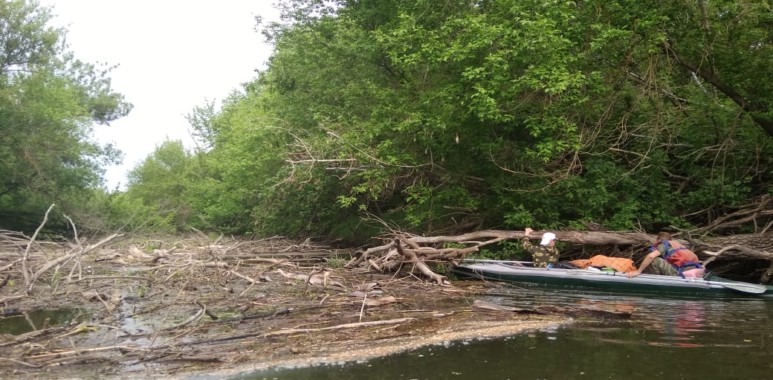 На 9-12 мая прогулялись по реке Чир со стартом от Солонецкого. Маленькая речка между Ростовской и Волгоградской областями, что впадает в Цимлянское море, оказалась оккупирована и забаррикадирована. Паводки приносят бревна, а бобры их усердно заплетают свежесгрызенными деревцами. За 4 дня прошли около 20 км и насчитали 12 серьёзных завалов, для расчистки которых приходилось вылезать из байдарки. И еще куча мелких завальчиков. Причём берега настолько круты, что и обнос нормально не сделать.