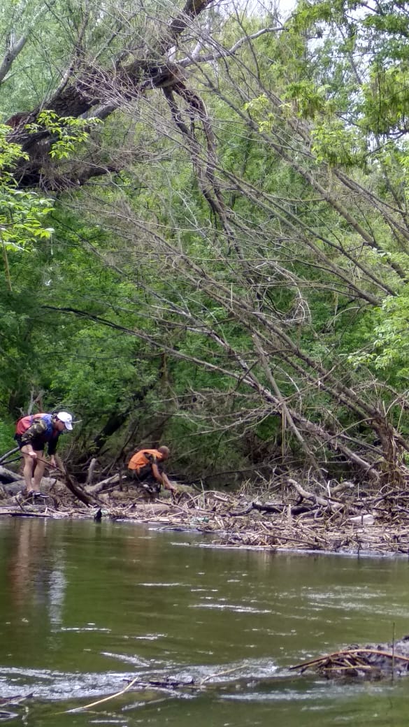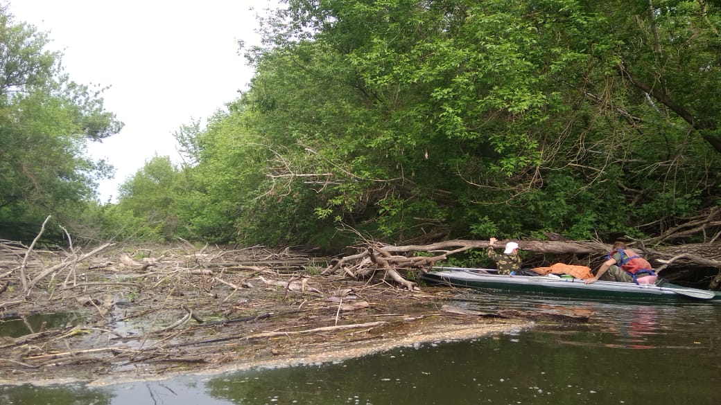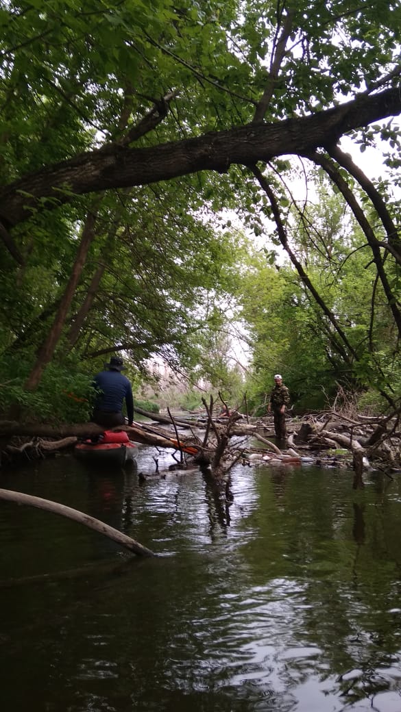 На 9-12 мая прогулялись по реке Чир со стартом от Солонецкого. Маленькая речка между Ростовской и Волгоградской областями, что впадает в Цимлянское море, оказалась оккупирована и забаррикадирована. Паводки приносят бревна, а бобры их усердно заплетают свежесгрызенными деревцами. За 4 дня прошли около 20 км и насчитали 12 серьёзных завалов, для расчистки которых приходилось вылезать из байдарки. И еще куча мелких завальчиков. Причём берега настолько круты, что и обнос нормально не сделать.