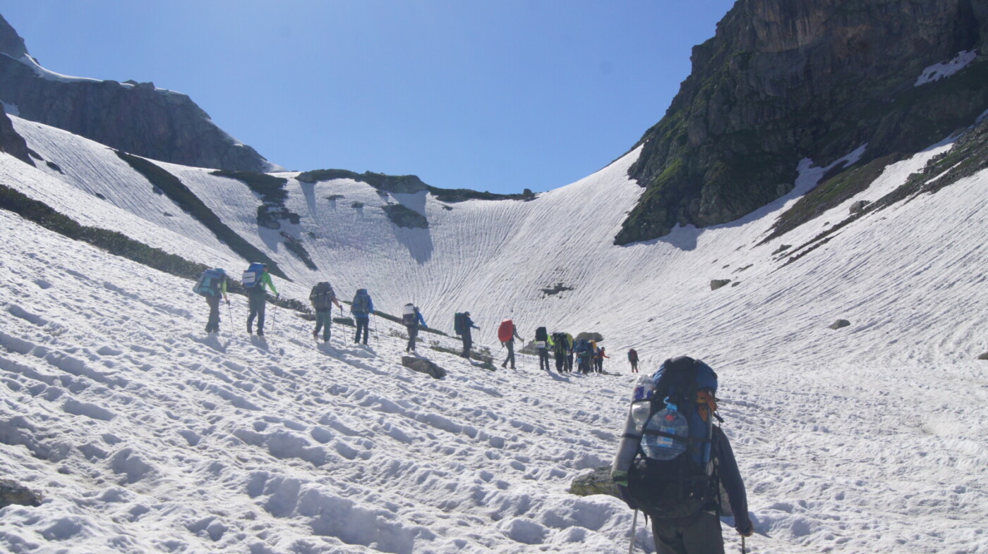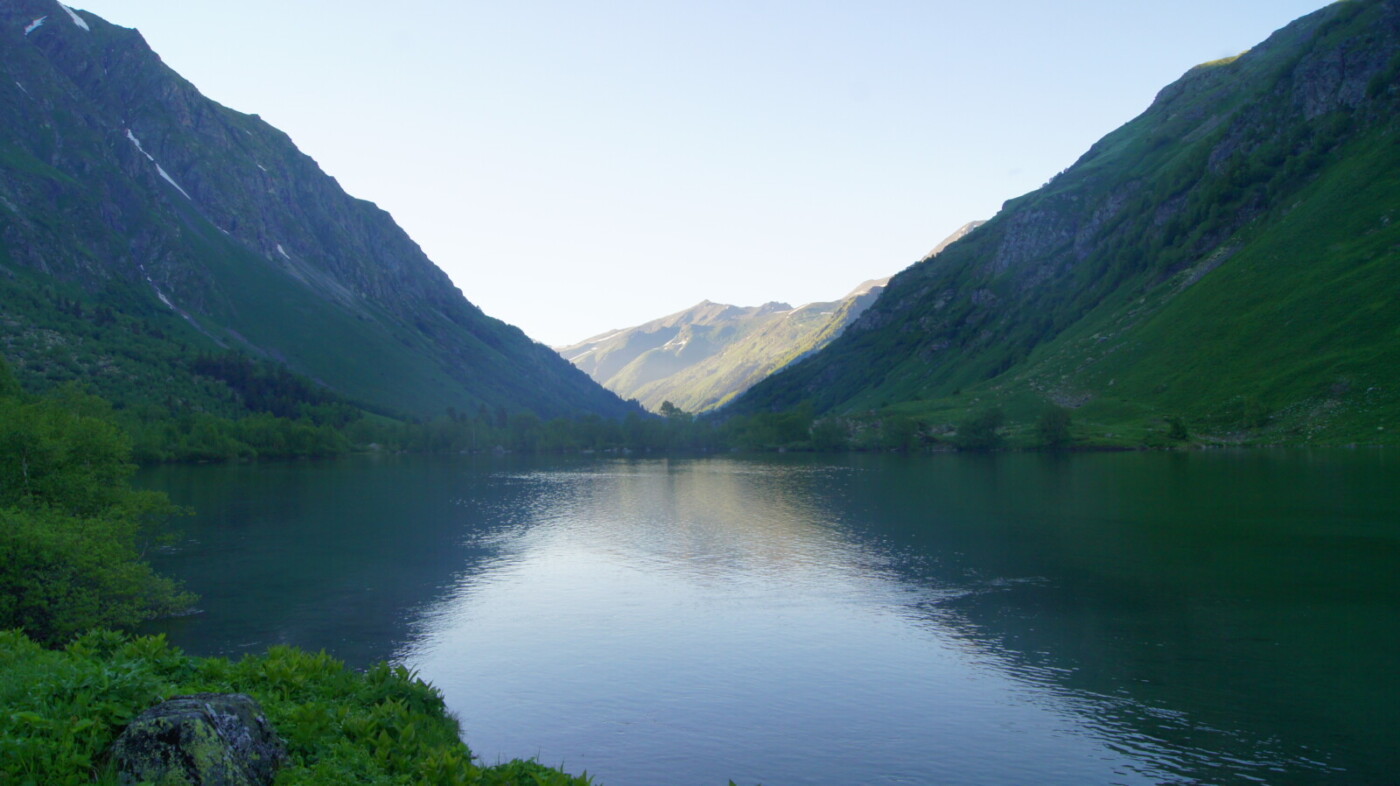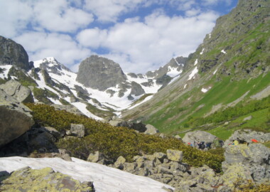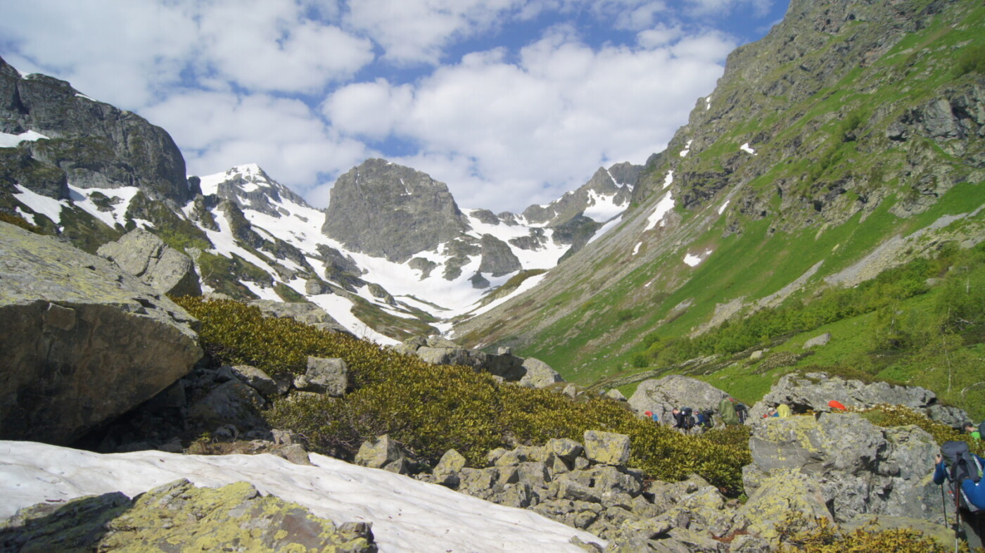 По планам подняться по ущелью на озеро Верхний Кардывач 600 м по высоте и спуститься назад. Общий километраж 8 км.