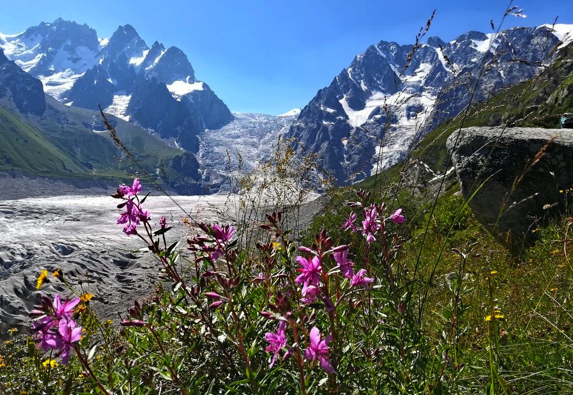 Сегодня у нас выход наверх, чтобы подойти поближе к Караугомскому ледопаду. Тропа идет на склону, прижимаясь к салам отрога. А вскоре лес расступится и мы выходим на гребень морены ледника (это такая осыпь которая образуется у ледника вследствие его движения и природных факторов). Караугомский ледник – один из крупнейших на Кавказе. Но особенно поражает его ледопад, который крутым сбросом спускается в огромного снежного плато с высоты 4000м до практически до 2500м. Вид его завораживает.