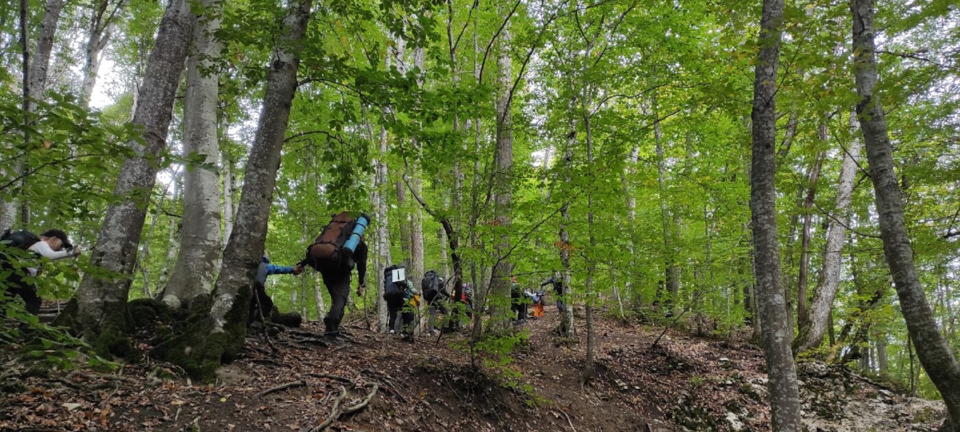 Сегодня мы выйдем на хребет, Тропа идет по лесу и периодически выводит на обзорные точки, гдето там вдали видно море. Но ночевку мы остановимся в живописном месте тур/стоянки Маски.