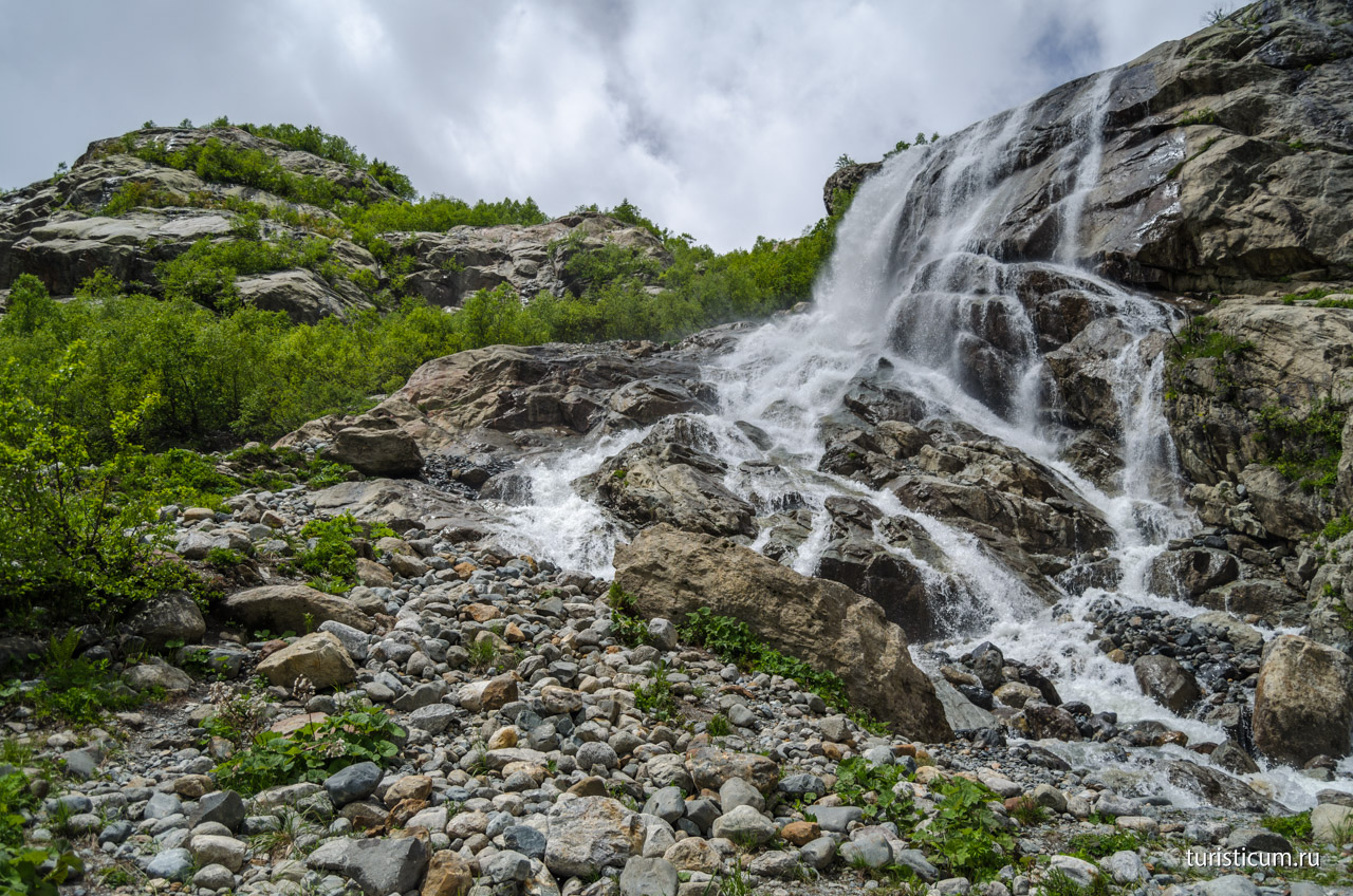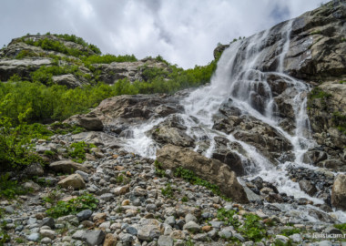 Заезд в пос.Домбай, 8.00 завтрак. Переодеваемся, берем с собой все необходимое и забрасываемся в Алибекское ущелье. Сначала едем на машинах высокой проходимости, ориентировочно с человека 500 рублей, это съэкономит нам время! Там мы пойдем к водопаду и если нас пустят, то к леднику Алибек – самый известный и знаменитый в Карачаево-Черкессии. Путь по живописной тропе!Далее обед по дороге с водопада, спуск обратно в пос.Домбай. По желанию можно подняться на канатной дороге, посмотреть панораму Домбайских гор. Ужин. Пройденное расстояние 7 км, набор 300 м, спуск 300 м.