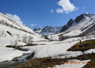 Будет все: возможность потоптать настоящий снег – много, броды через реки, три перевала, жаркие костры, и конечно потрясающие виды заснеженных гор!