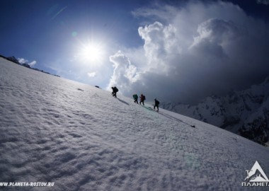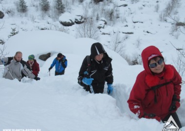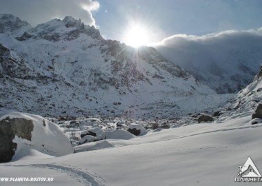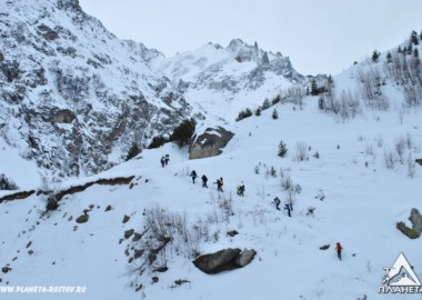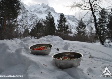 Решила все новогодние праздники провести с планетой в горах. Сурово, но не отъедаться ведь снова как из года в год. Спорт, здоровый образ, жизни, немного экстрима, новые красивые места - как встретишь Новый год, так его и проведёшь. Сначала я выбрала программу лайт - проживание в отеле с Глебом Албулом в Приэльбрусье. Но Лена Таранцева, зная мою страсть к издевательству над собой, посоветовала записаться на программу экстрим будет. Пролистала программу, посмотрела - одна ночевка в горах в палатке зимой - мелочи жизни, подумала я и с радостью поменяла программу... За две недели до выезда я с ужасом увидела прогноз погоды в новогоднюю ночь на месте встрече... Погода точка ру обещала минус 27, а по ощущениям минус 39... Мерзлячка по своей природе я почувствовала приступ паники, я замерзала в палатках и при минус 5... Но минус 39, я даже представить не могла себе такой температуры... С тех пор как я узнала погоду, я перестала спать по ночам, думала отказаться, не ехать, притвориться мертвой, я достала Яна Албула расспросами о том, как выжить. В итоге я решила, что мне интересно себя испытать, интересно посмотреть на себя в такой температуре, узнать на что способно моё тело, вдруг когда-нибудь мне приспичит восходитель на какой-нибудь Эльбрус... Я очень плотно подошла к вопросу одежды, купила новую пуховку, бахилы, снабдилась штанами-горкой, балаклавой, двумя спальниками, затарила безумное количество одноразовых грелок. Когда я это все одевала была похожа на колобок. Смело можно было лететь в таком снаряжении на марс. Приехали мы на место рано утром, я отлично выспалась в спальнике на полу в автобусе как заядлый турист. До самого выхода из автобуса я все ещё сомневалась в правильности выбора способа встречи Нового года. Но место, куда мы приехали было по-настоящему волшебно -лес, горы, и вокруг белым бело, больше всего люблю зимние походы из-за белых пейзажей. Мы прошли через пост в заповедник и попали в наш скромный альплагерь. Окружённый горами, большими камнями на лагерь просто рай для альпинистов. Нас расселили по номерам, при чем без гендерного различия. Я попала в номер с тремя девочками и одним мальчиком. Номер был достаточно аскетичен, продавленные кроватки, старенький шкафчик, розетки не работали, ужасненький туалет один на весь этаж. Окна были высоко на потолке и в дыру между ними было воткнуто розовое одеяло. Мы предположили, что предыдущая группа альпинистов жумарила до потолка для того, чтобы воткнуть туда это одеяло. Иных путей достать туда не было. Но одеялко отнюдь не согревало номер, просто придавало определённый антураж. Душ почему-то был на первом этаже, чтоб туда попасть надо было выйти наружу из лагеря по холоду и войти в какую-то пристройку. И горячая вода была только вечером в определённые часы, но и то на всех её не хватало. В соседних номерах жили крутые альпинисты из клуба маи, москвичи. Я случайно увидела, что в их номере кроватей 20 стояло в ряд спинка к спинке, так они в рядок и спали. Утром делали зарядку хором, очень дружные ребята. Не успев обустроиться, мы кое-как покидали вещи, поели и двинулись в путь, Новый год по плану мы должны были встретить далеко в горах в процессе восхождения на зеленой гостинице - так называется место, не гостиница, где разбивают палатки альпинисты и восходят на разные вершины. Печалька была в том, что я все гр