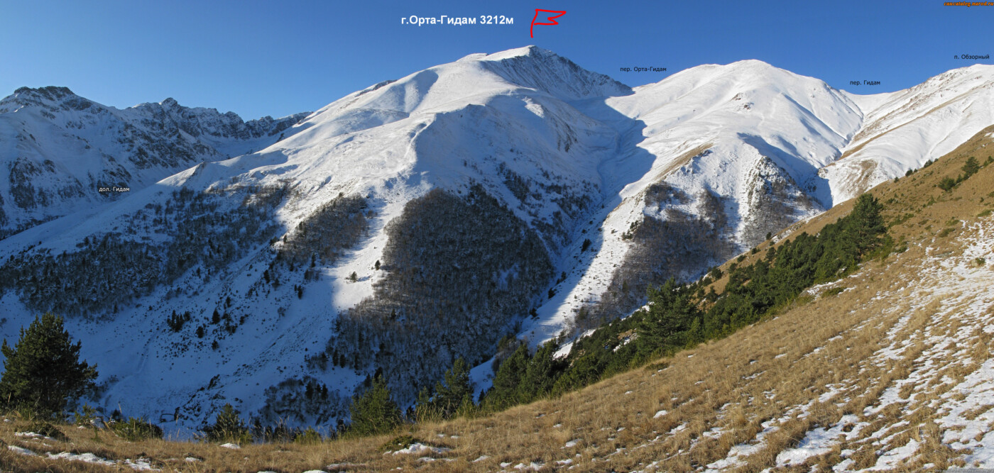 Вершина Орта-Гидам 3212м расположена в междуречье долины Аксаут и Теберда. Она находится в стороне от популярных маршрутов.