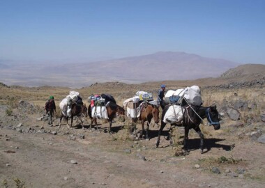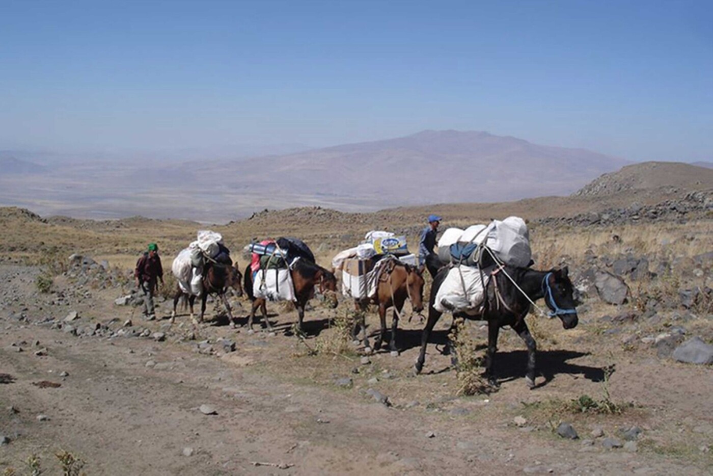 Заброска груза на вьючных животных от начала маршрута до лагеря 1 и из лагеря 1 в лагерь 2.