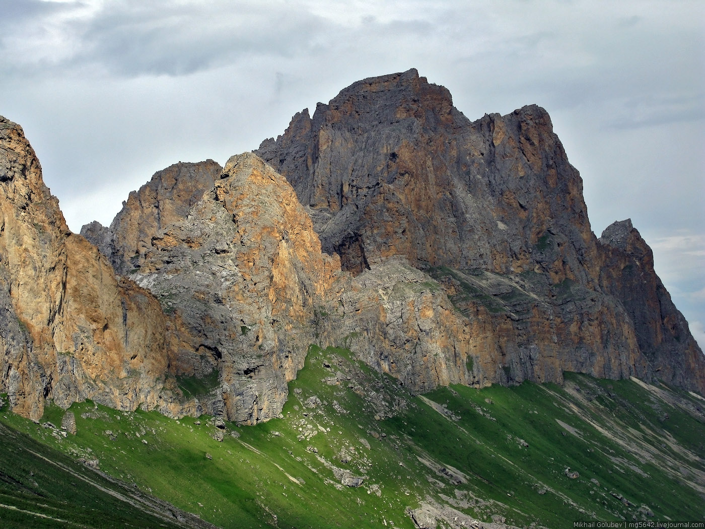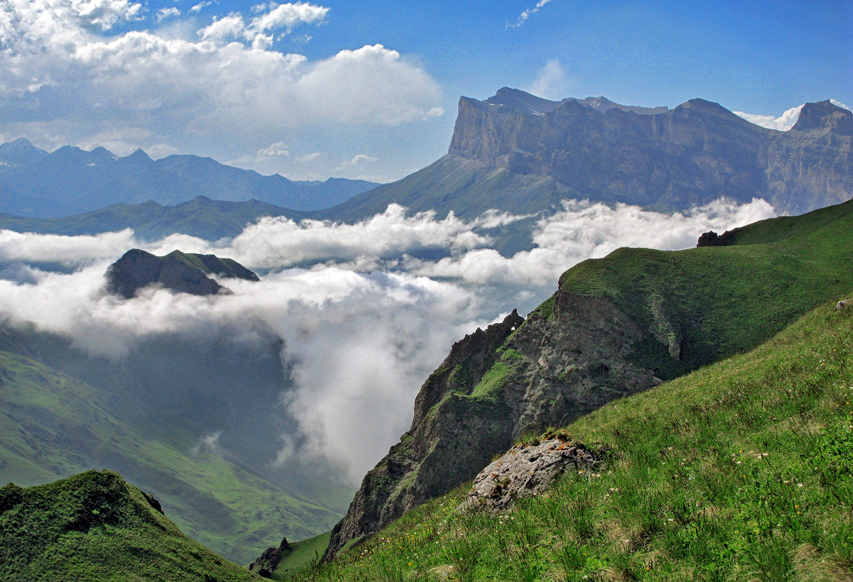 С утра наслаждаемся видами. Собираем лагерь, поднимаемся на перевал Саухауз начинаем спуск по тропе в ущелье Чайнашки. Нам предстоит сбросить около 1500м. Тропа идет сначала вдоль бастиона скал. Дух захватывает. Потом спускаемся в солнечную живописную долину, ведущую к Верхней Балкарии. Ночевка на живописной поляне у подножия Горы