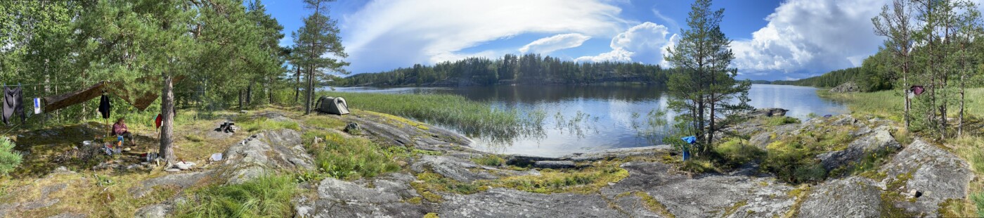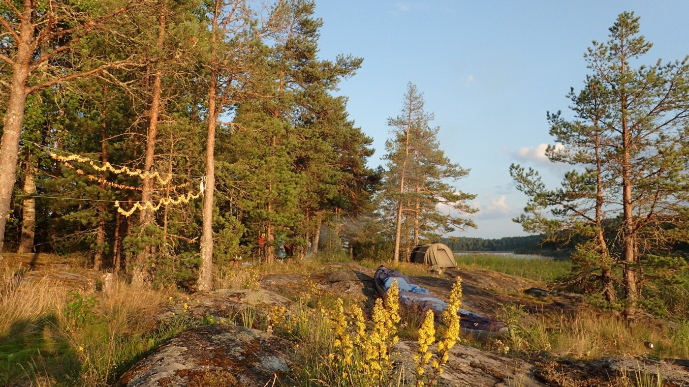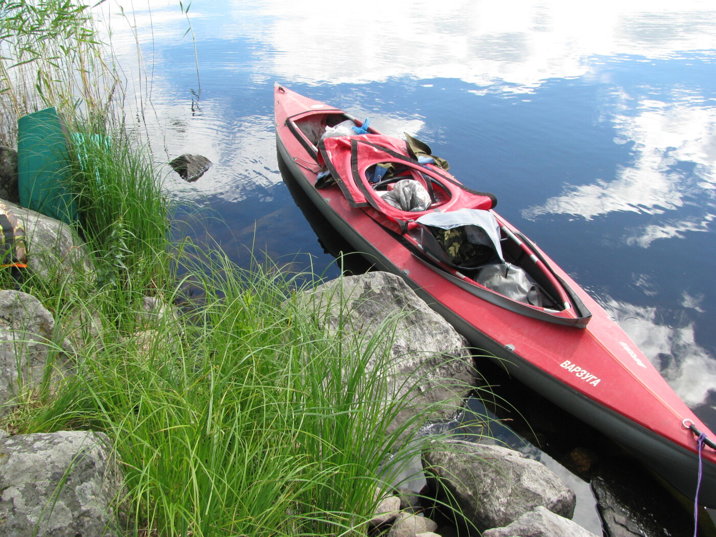Вода прямо из Ладоги вполне нормальная. Стоять почти везде придеться на камнях голых чуть прикрытых мхом или черникой, жестковато. Пожалел что не взял надувной матрас. Купаться кое-где в заливах, типа Кочерги можно дольше 2 минут, вода порядка 16-18гр. В открытой Ладоге разве что символически окунаться, +10-12гр. Теперь по просьбам трудящихся конкретика. Ехать поездом - нудно и долго, столько спать надо уметь. Для зарядки гаджетов лучше иметь внешние аккумуляторы, розеток в плацкарте 2-3 штуки и на них толпа желающих. Ну или читать электронную книжку, ее на неделю хватит легко. Связь довольно часто пропадает совсем. По снаряге: по погоде очень похоже на какой-нибудь майский сплав, то есть нужно иметь майку и солнцезащитный крем на день и термуху, флис и теплый спальник на ночь. Я спал в спальнике с комфортом -4 без термухи и не застегиваясь почти. Нужно учитывать что не всегда получится посушить намоченные дождем или волной вещи, так что лучше четко поделить на ходовое (вечно сырое) и стояночное (посуше, но более дымное), ну и есть смысл оставить какую-то маечку и шорты на обратный поезд, чтобы не шокировать пассажиров запахом копченостей. На ходу даже если тепло и солнечно желательно иметь в зоне быстрой доступности (пакет или мелкий рюкзачок непромокаемый) что-то средне-теплое и непромокаемую ветровку, куртку каякерскую например, плюс непромокаемые штаны. Полиэтиленовый дождевик не лучший вариант, рвется и парусит. Погода меняется очень быстро, можно выйти из-за мыса и схлопотать носовую волну с дождем. У меня основные сложности вызывал выбор обуви, все хотелось сэкономить место. По итогу шел в каякерских тапках, выходить иногда холодно, но в байдарке вполне нормально и компактные. Еще неплох вариант неопреновых носков (2-3мм) и на них резиновые сандалии (ни в коем случае не шлепанцы). Неопреновые ботинки будут еще комфортнее, но тут уже надо объем вещей смотреть. Шлепанцы любые категорически не подходят для переходов, высадка/посадка почти всегда на камни и почти всегда они скользкие. на стоянке хорошо себя показали обычные галоши со вкладышами по 150р, местные чаще всего ходят в сапогах, но это мне объем не позволил. Шлепанцы хороши в поезде и иногда на стоянке если сухо. Получается что самый компактный вариант - галоши, сандалии не боящиеся воды и неопреновые носки. Также сразу нужно думать насчет сиденья в байдарке, ходки могут быть и по 2,5 часа. Тут у каждого свои предпочтения, кто-то и на голом кильсоне может 3 часа высидеть )). Компактный вариант - надувная подушка небольшая на дно(только поновее, они долго не живут) плюс каремат под спину, ну и хопа (сидушка) куда сильнее давит.