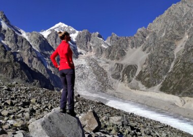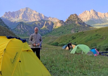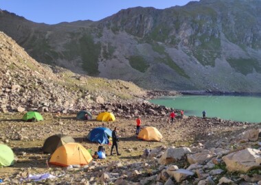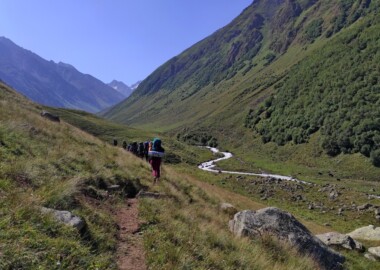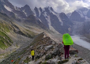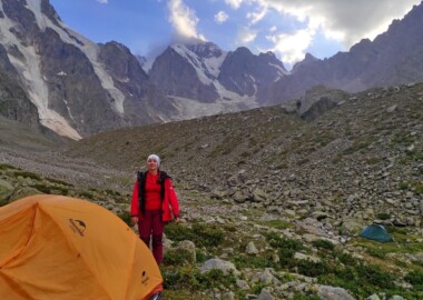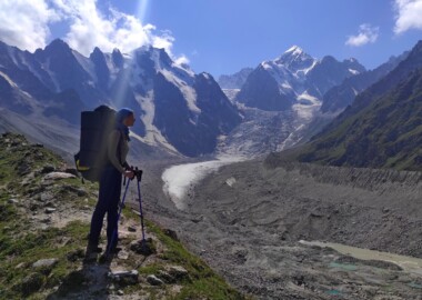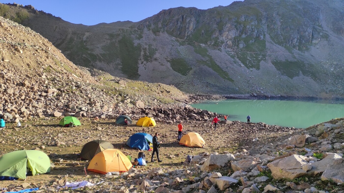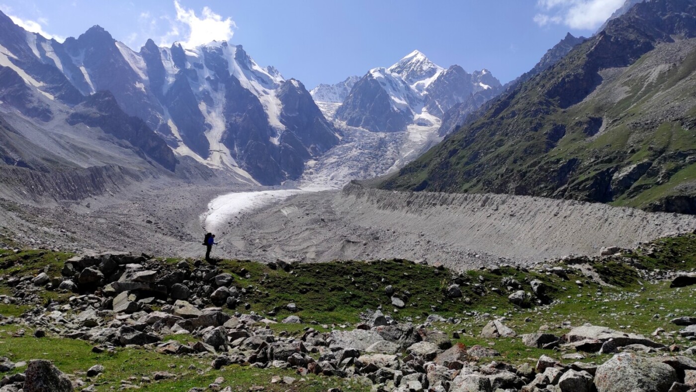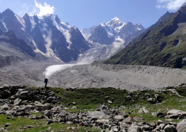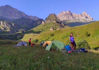 Преодолев все трудности мы спустимся в “карман” морены ледника Уллуауз. Заночуем уже ниже камней на живописных полянах.