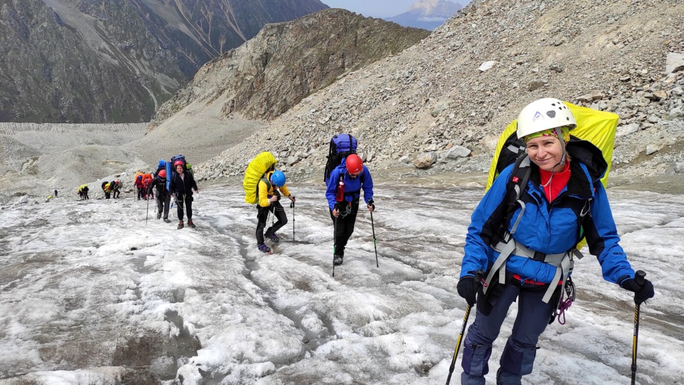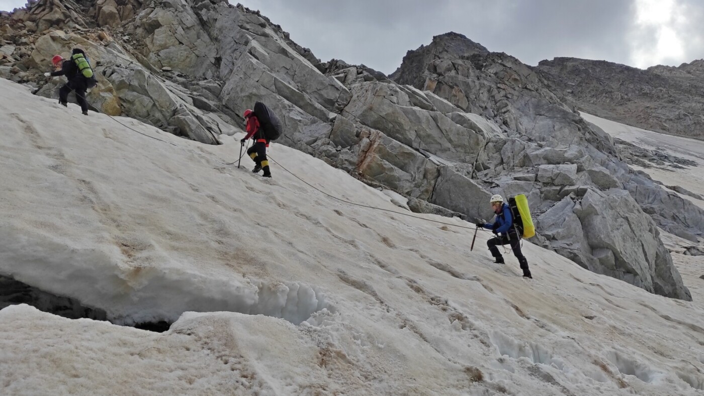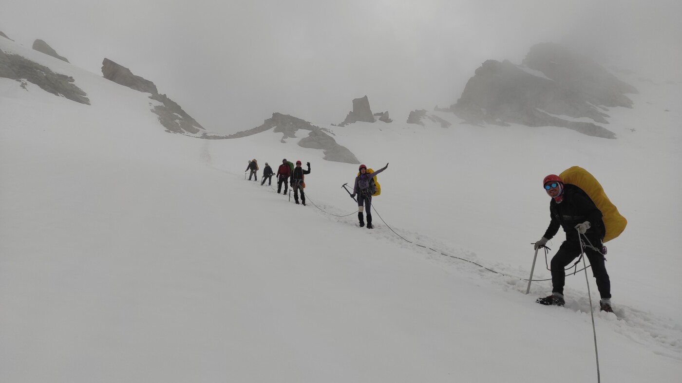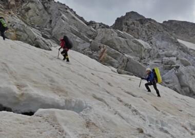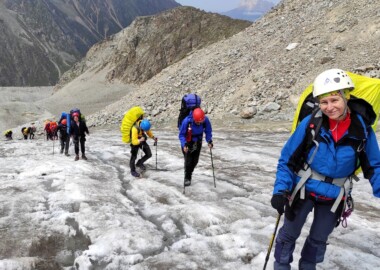 Спуск с перевала идет по леднику, поэтому здесь нам предстоит одеть кошки, системы, каски, и мы свяжемся веревкой в “связки” для безопасности. Еще один сложный участок, это сойти с ледника на морены.