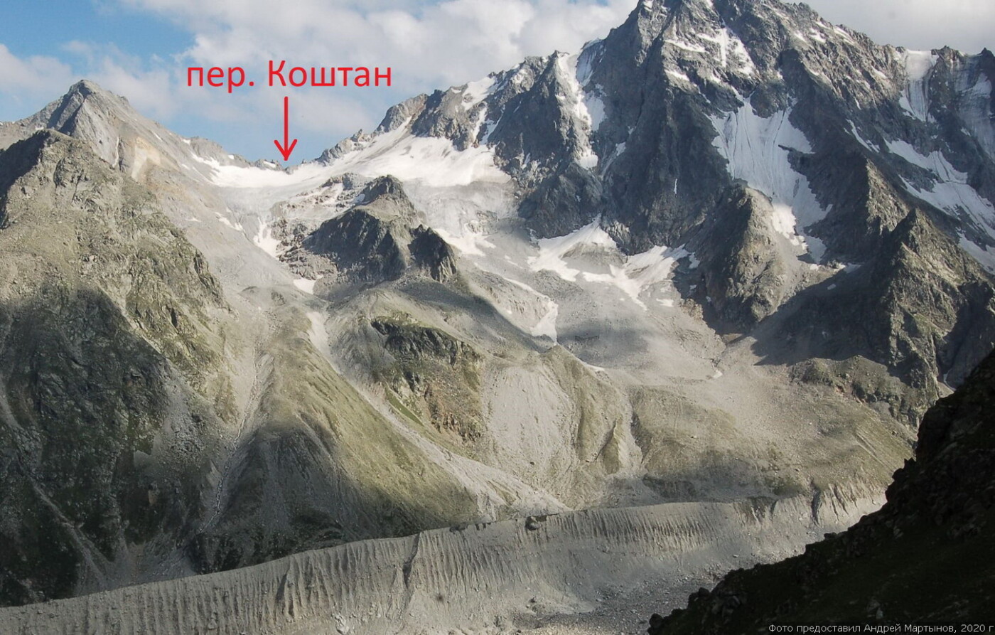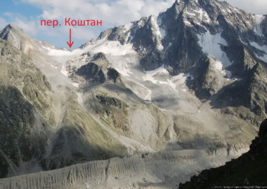 Ключевой день похода. На предстоит пройти перевал Коштан 1Б 3513м. Путь на него идет по осыпям. На саму седловину ведет крутой скально осыпной кулуар. Обязательно одеваем каски, двигаемся плотной группой. На седловине нас ждет грандиозный вид. Открывается ущелье Думала. Впереди огромный мощный ледопад Уллуауз, стекающий со склонов пятитысячника Коштан-тау 5152м. Прямо напротив вершина Думала -тау 4681м