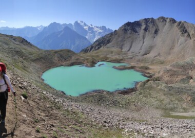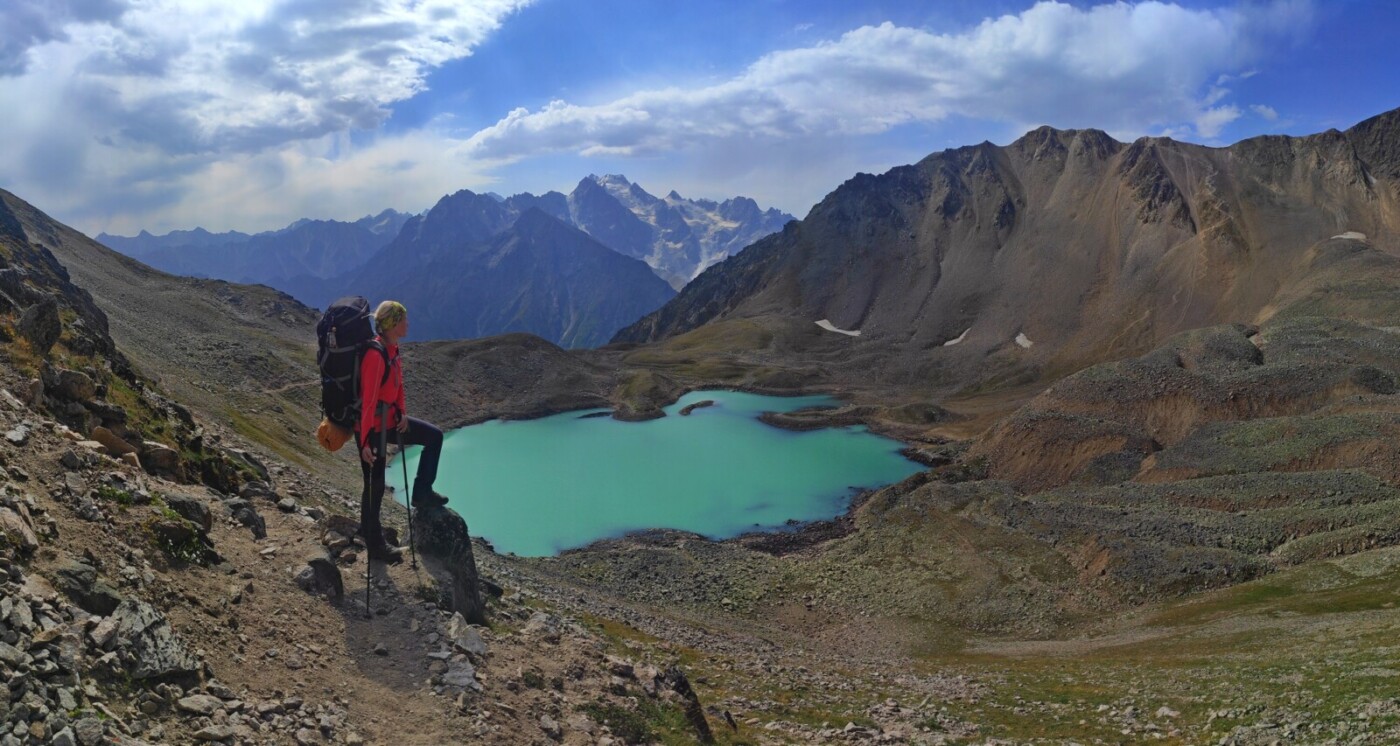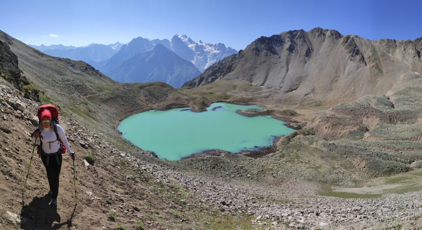 Собрав лагерь поднимаемся вверх по ущелью. Впереди виден перевал Пастуший 3244м. Путь на него идет по хорошей осыпной тропе. С перевала открывается вид на висячую долину озера Гийбашкель 3150м. Спускаемся к нему и на берегу становимся на ночевку. В это время года на озере еще возможно будет немного снега.