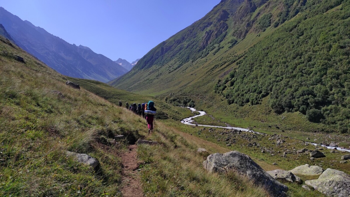 Сбор лагеря. Чтобы спустится вниз еще придется немного подняться, так как тропа обходит прижимы долины. Спускаемся в ущелье Безенги и далее до поселка Безенги. Маршрут закончен.