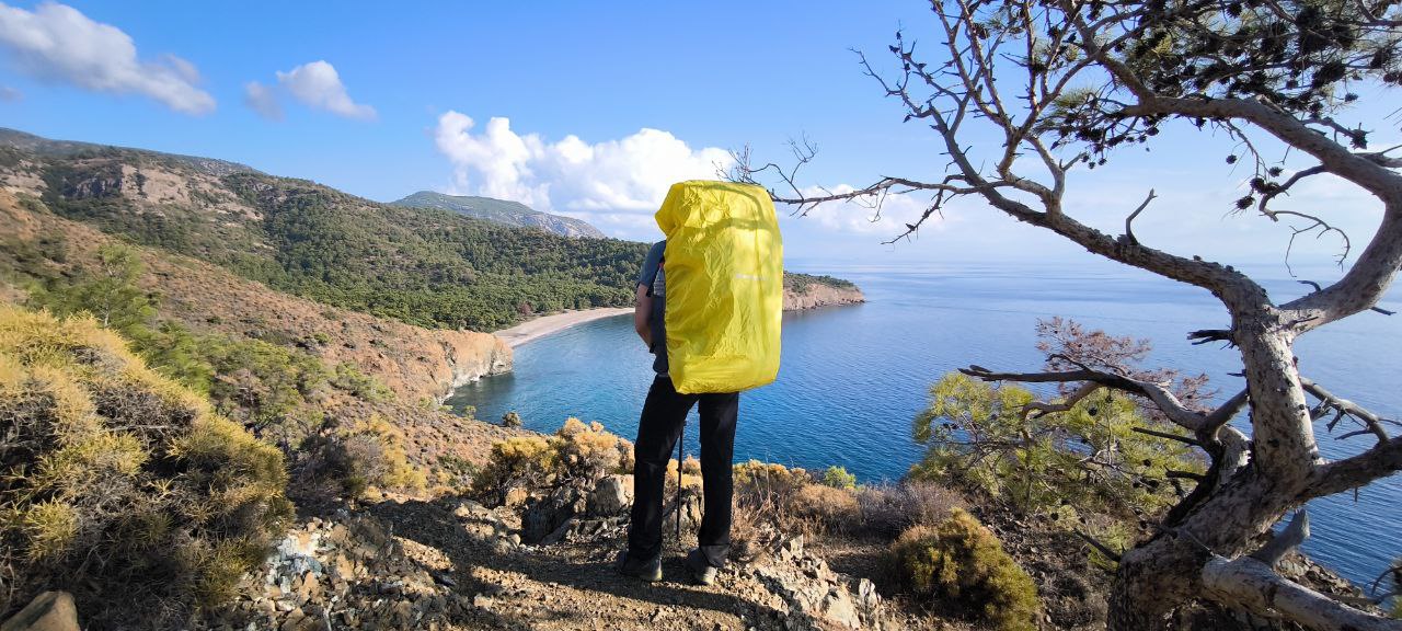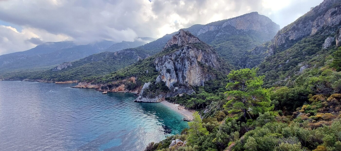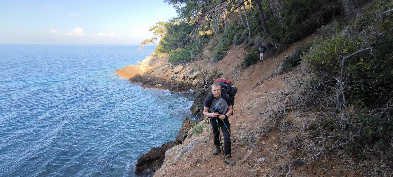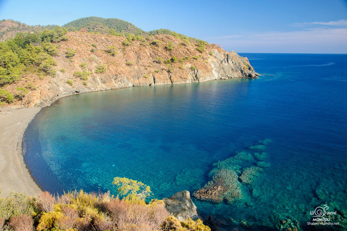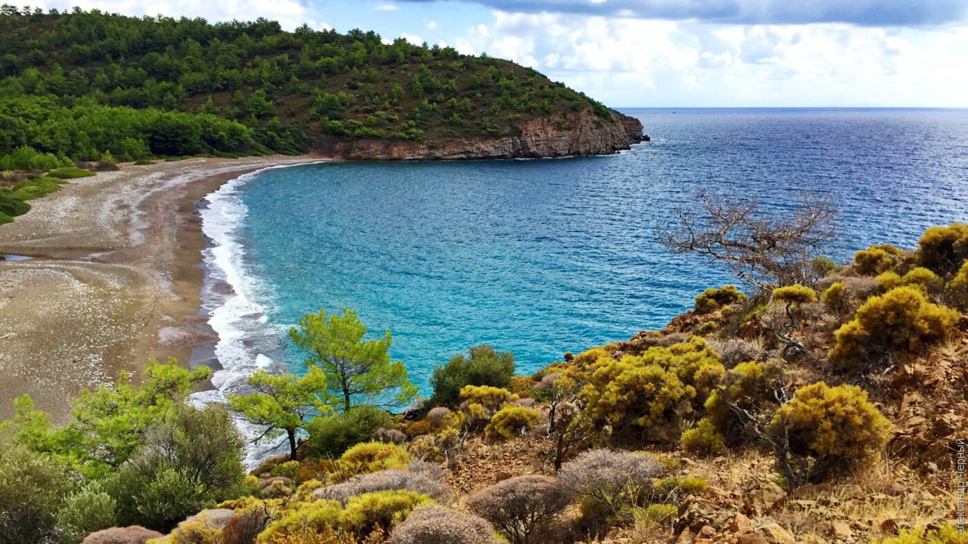 Сегодня мы держим путь через две очень разные бухты туристического городка Овубюкю, где обедаем и купаемся на безлюдном пляже. Овубюку это туристический городок для местных и вне сезона кажется, что в городе и на пляже мы одни. Посетим магазин. После поселка преодолеваем чуть затяжной перевал, откуда открывается потрясающий вид на греческий остров Родос. Минуем несколько лазурных бухт, сделав привалы на них с возможностью искупаться.