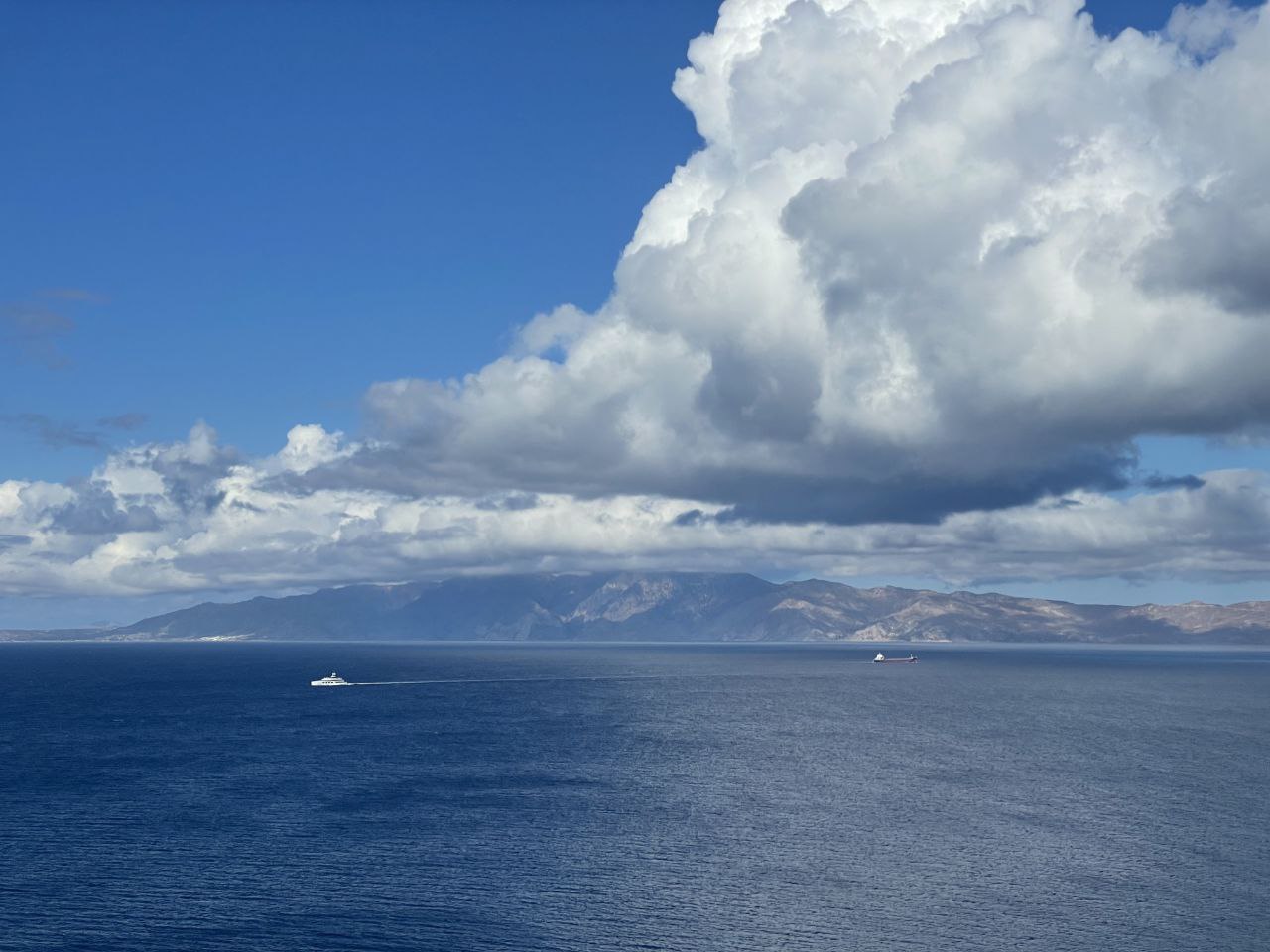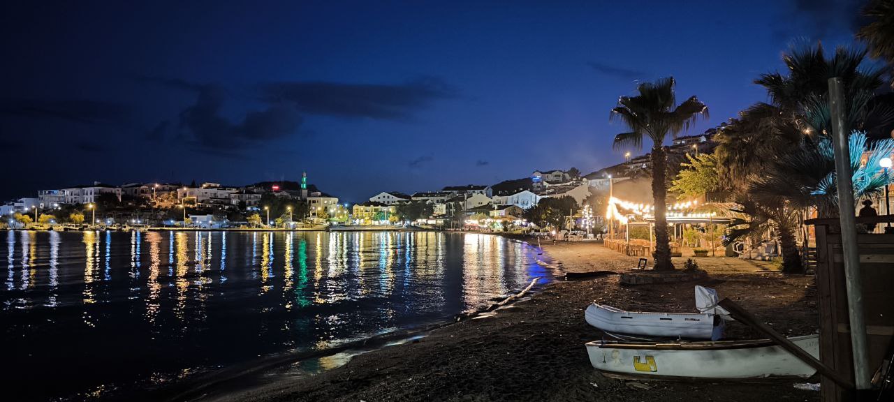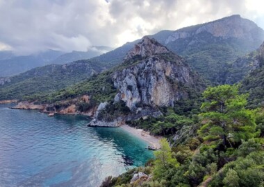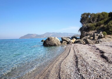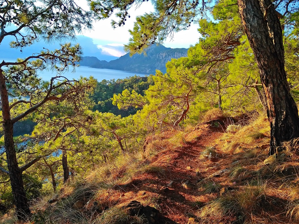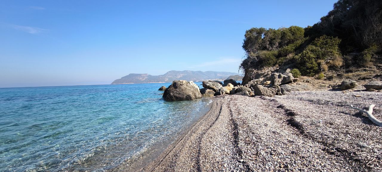Сегодня мы держим путь через две очень разные бухты туристического городка Овубюкю, где обедаем и купаемся на безлюдном пляже. Овубюку это туристический городок для местных и вне сезона кажется, что в городе и на пляже мы одни. Посетим магазин. После поселка преодолеваем чуть затяжной перевал, откуда открывается потрясающий вид на греческий остров Родос. Минуем несколько лазурных бухт, сделав привалы на них с возможностью искупаться.