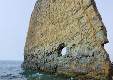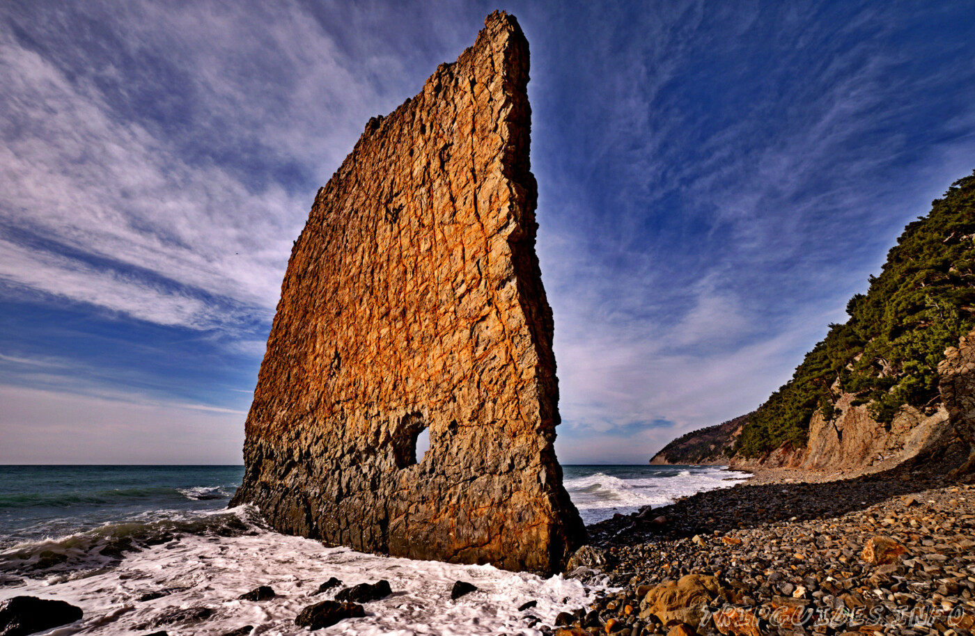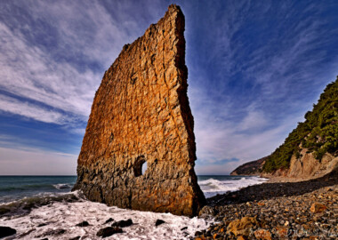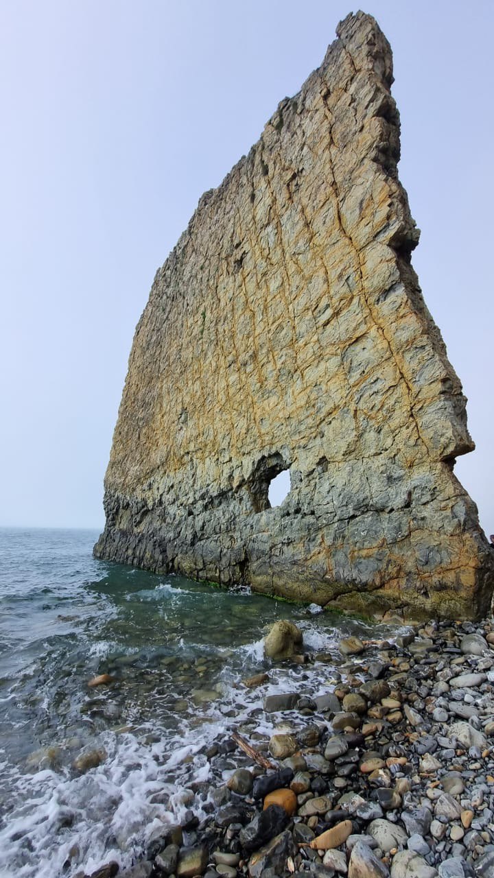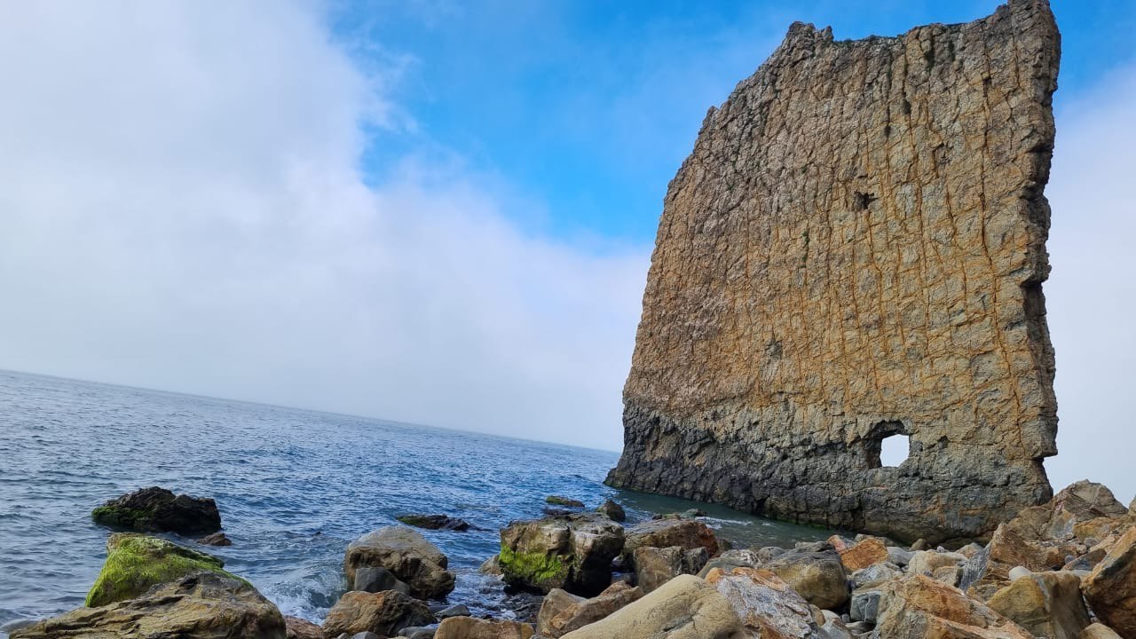 Это плоская скала тридцатиметровой высоты и двадцатиметровой ширины напоминающая своим видом парус. Один её конец омывается морем, а другой упирается в берег. Появление такого необычного «паруса» объясняют действием прибоя и ветров. Ещё более загадочно появление отверстия в нижней части Скалы Парус. Официальная версия образования отверстия – след от пушечного ядра, который появился в середине XIX столетия. Загадочно, не правда ли…