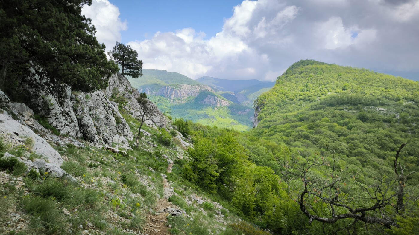 Сначала мы по пологой тропе подойдем к водопаду Серебряные струи, отсюда начнем подъем на Сююрю-кая и через “западную калитку” на Серт-Кая и далее пещере Дальче-коба, в которой расположен родник. Рядом на Барской поляне разобьем наш лагерь. Отсюда будем любоваться панорамами Большого крымского каньона и горы Бойко.