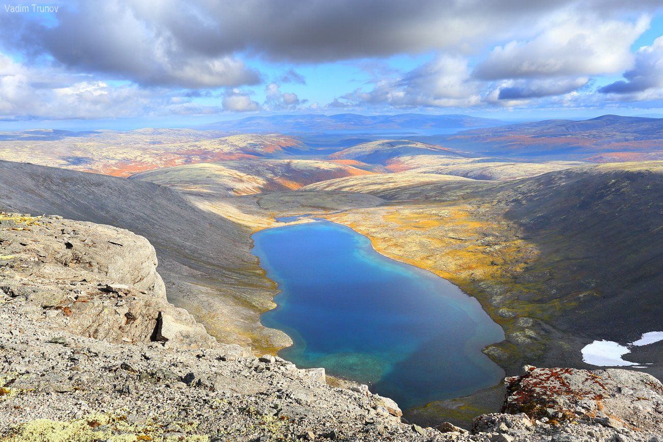 И вот мы уже у озера. Озеро Академическое – самое высокое из крупных Хибинских озер. Оно лежит на высоте около 750 метров и расположено всего на двести метров ниже седловин ближайших перевалов. Идеально прозрачная вода заполняет вытянутую котловину. На берегу ставим палатки и организовываем стоянку.