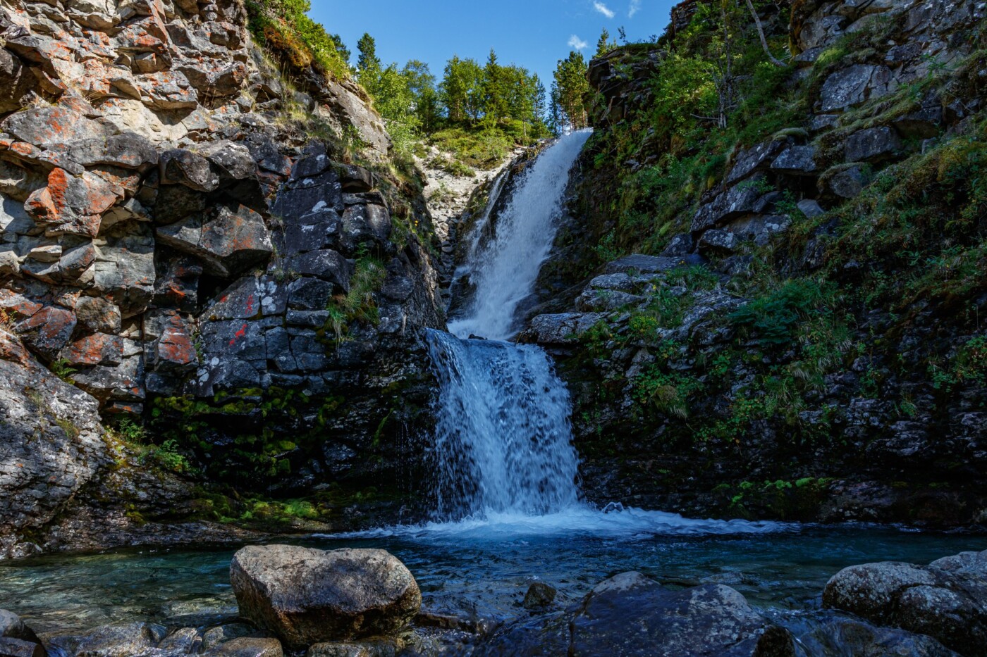 Собираем лагерь и идем на стоянку к Озеру Академическое. Но сначала зайдем на водопад Красивый, который находится на реке Рисйок. Водопад очень живописный, вода в нем, как и во всех реках и ручьях Хибин аквамаринового цвета и исключительно чистая.
