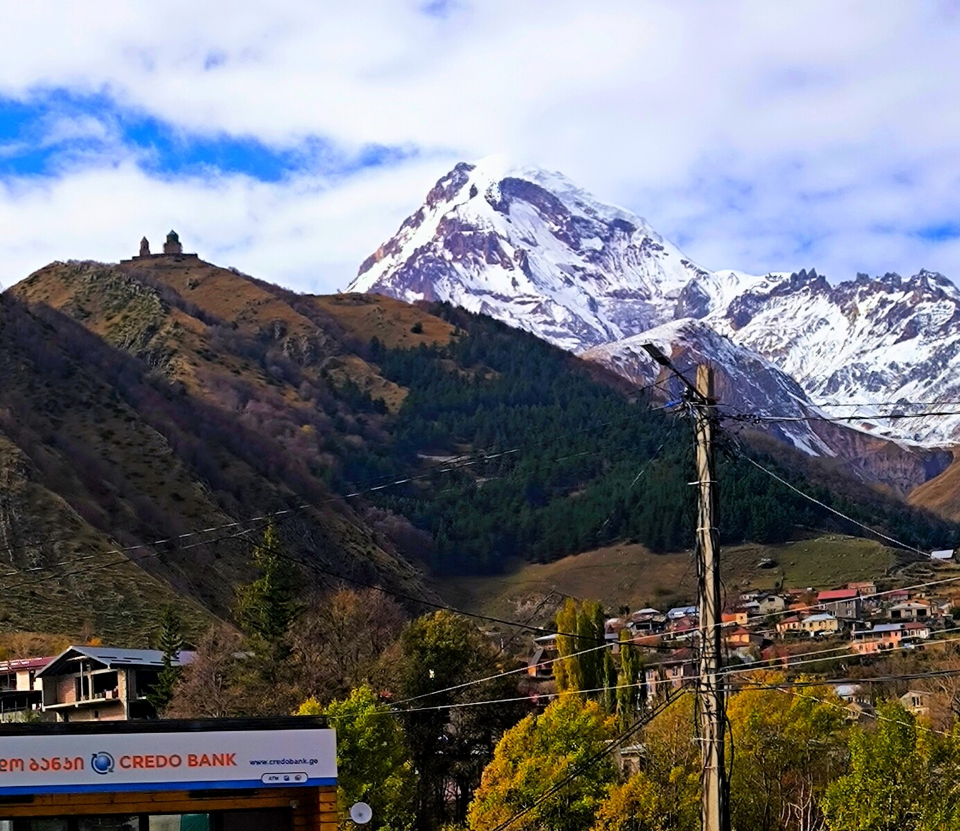 Кто поедет через Владикавказ мы планируем заказать трансфер из Тбилиси. Обязательно сделаем остановку у смотровой площадки на Казбек. Отсюда если ясная погода, как на ладони, видна величественная двуглавая вершина и крошечный, словно игрушечный, храм Гергети, парящий над бездной.