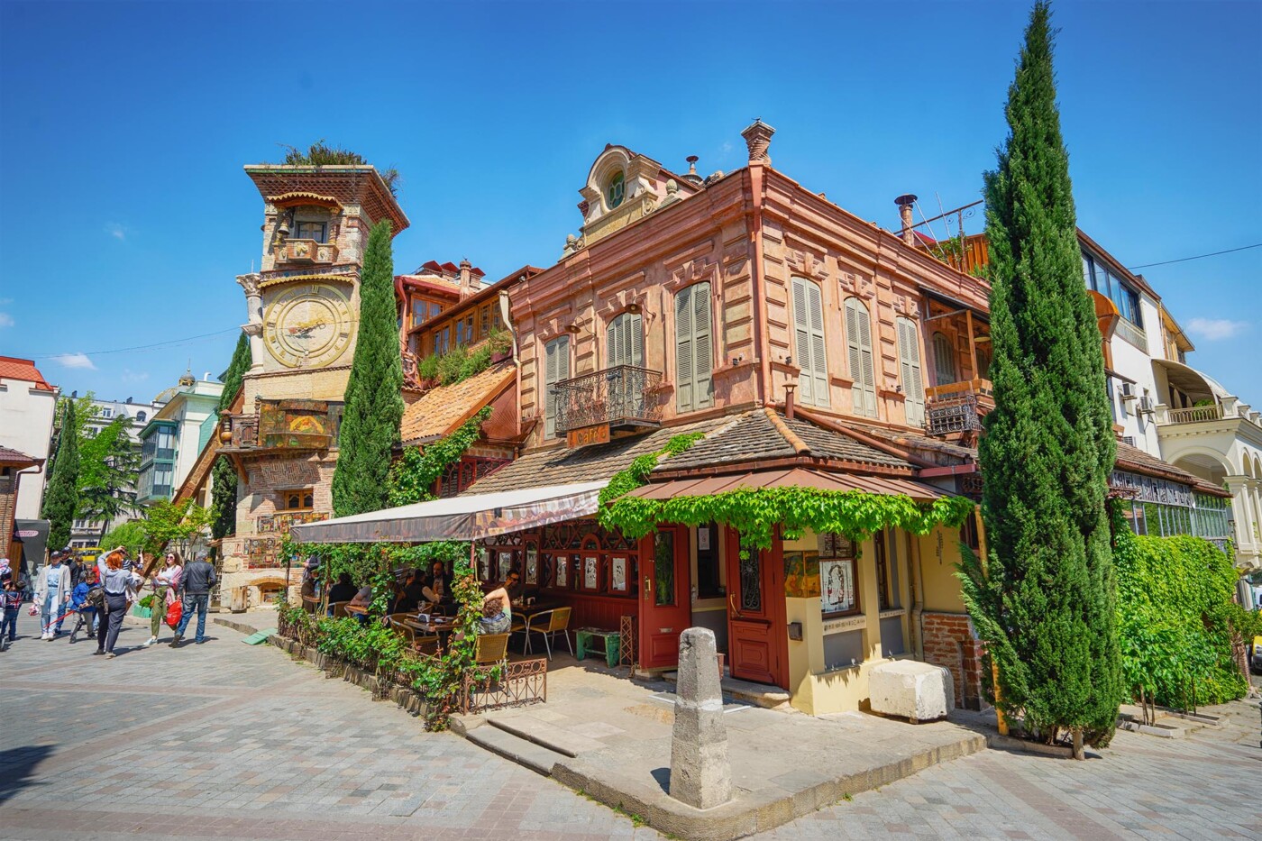 Отсюда спустимся пешком по каскадным лестницам прямо к проспекту Руставели — шумному, живому, с его особняками и театрами. Пообедаем в уютном местечке, попробуем настоящий хачапури и наберемся сил.