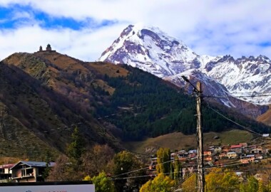 Кто поедет через Владикавказ мы планируем заказать трансфер из Тбилиси. Обязательно сделаем остановку у смотровой площадки на Казбек. Отсюда если ясная погода, как на ладони, видна величественная двуглавая вершина и крошечный, словно игрушечный, храм Гергети, парящий над бездной.